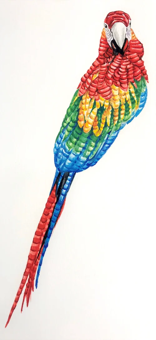 This piece was inspired by the colors of Colombia. My research for this project included exploring Colombian flora and fauna, learning about the colors that are important to Colombian culture and heritage, and looking at local arts and crafts. Every element of the design, every stich and bead, was painted using watercolors.