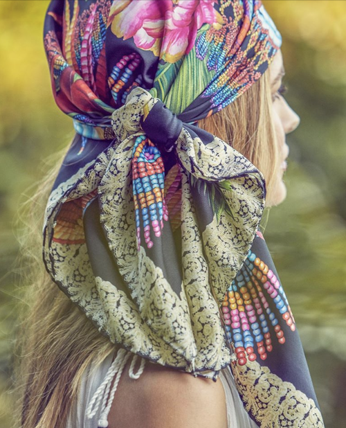 This scarf reflects my dreams of India, and the flowers and wildlife found there. I was inspired by the symbolism of its flowers: Dahlias, which represent dignity and elegance; bluebells, which represent humility and gratitude; marigolds, which represent passion and creativity; nasturtium, which represent strength, protection and conquest; bi-colored roses, which represent unity and enduring love; and the rose-ringed parakeet, which represent love and friendship. In every flower, bird and tiger, there exists a world of symbols.