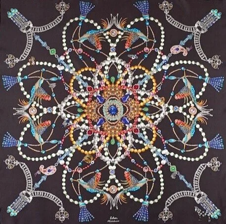 This scarf was inspired by the story of a sunken ship that was discovered off the coast of Colombia in 1708 which was turned into a tropical fantasy. Through this window, we see exotic animals and fish who swim curiously around the remains of the sunken ship and jewels of the shipwreck.